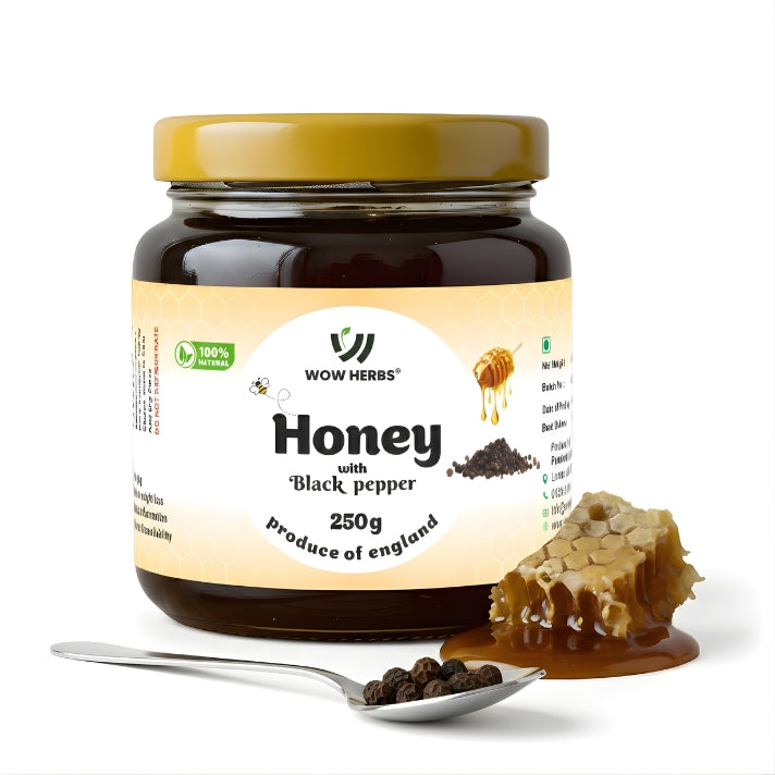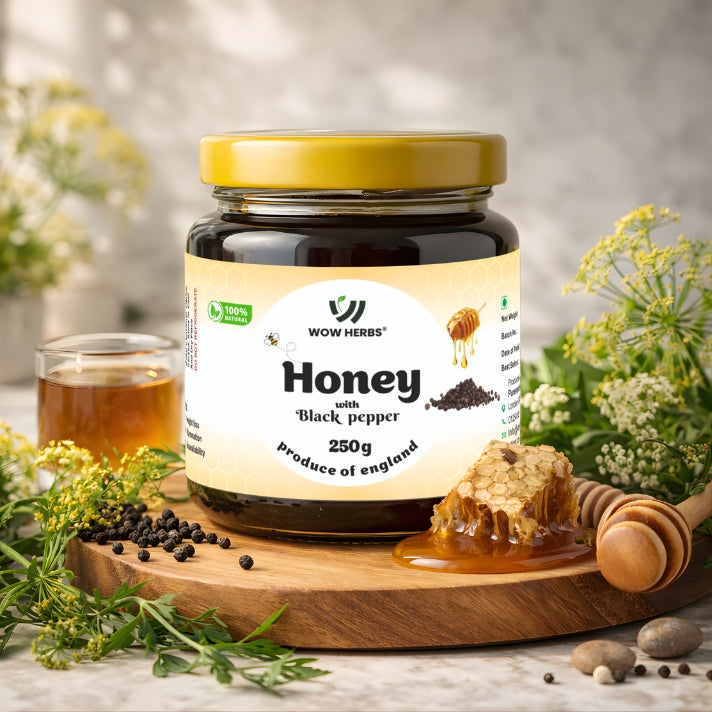 WOW HERBS Honey with Black Pepper combines raw English wildflower honey with Black pepper, known for its anti-ageing and antioxidant properties. This nourishing blend helps reduce inlamation, aids respiratory health, promotes joint comfort, and contributes to bioavailability, Ideal for daily use as part of a natural wellness routine.