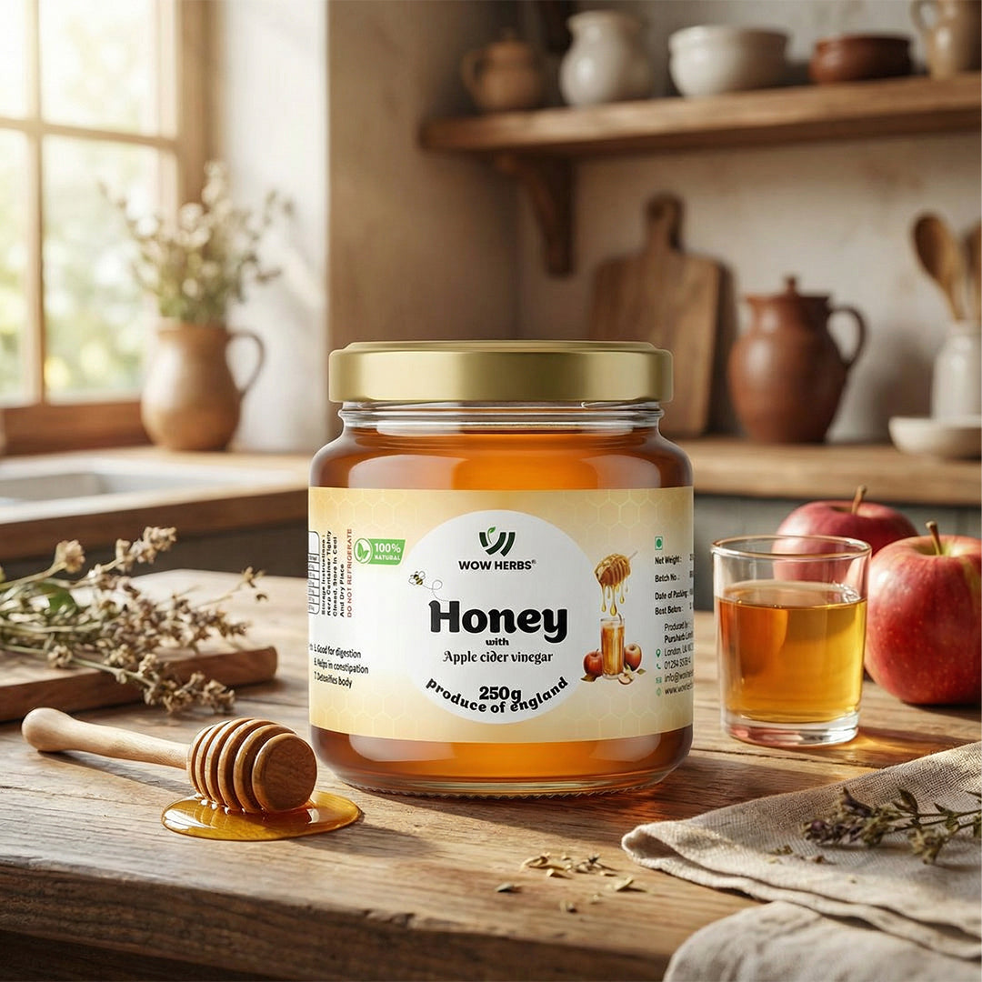 WOW HERBS Honey with Apple Cider Vinegar combines raw English wildflower honey with natural ACV to create a powerful wellness tonic. Rich in antioxidants and essential nutrients, this blend supports healthy digestion, aids weight management, boosts energy naturally, and promotes gentle detoxification as part of a balanced lifestyle.