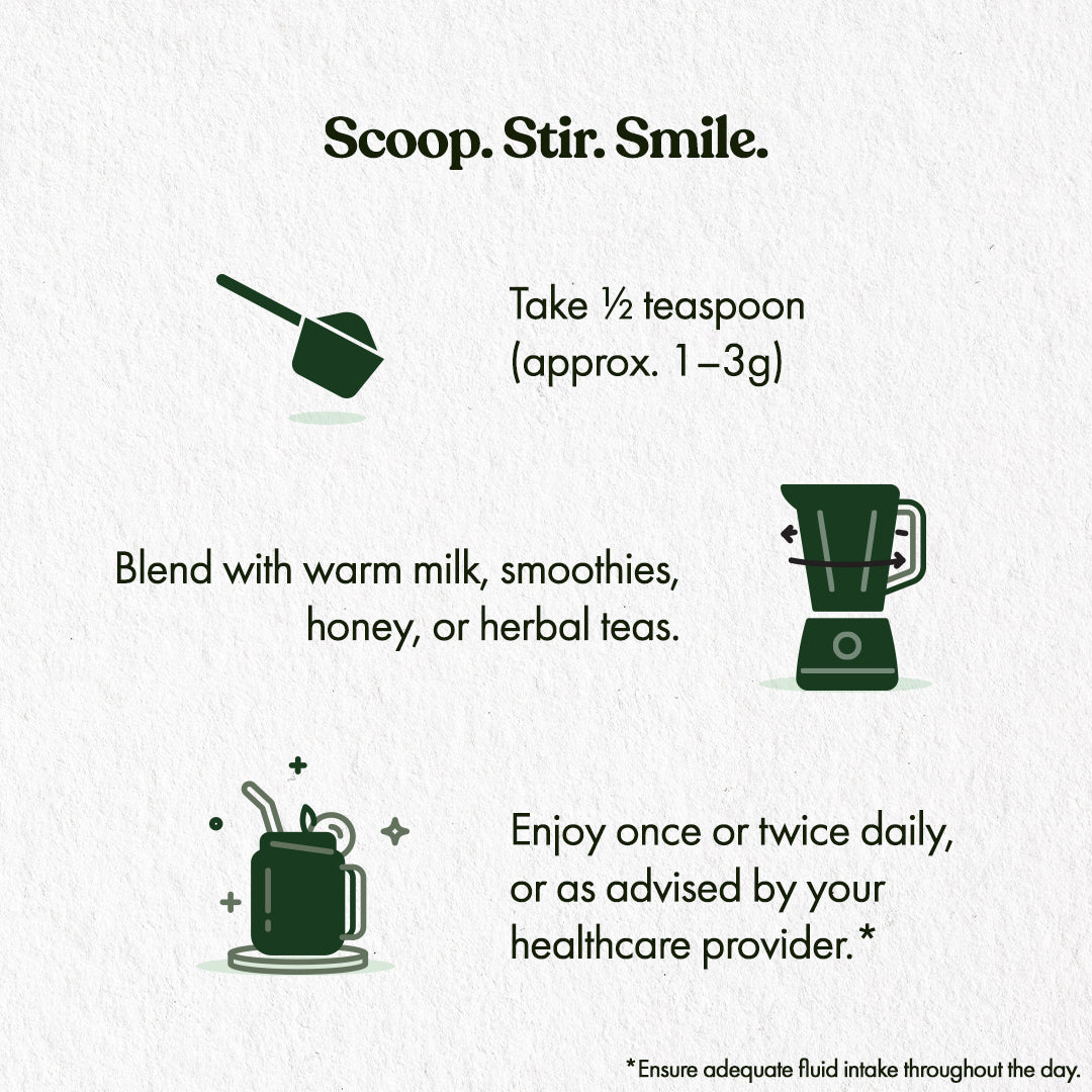 Mix Β½ - 1 teaspoon (approx. 2-3g) with warm water, juice, smoothies, or herbal teas. Drink immediately after mixing. Consume once or twice daily or as advised by your healthcare provider. Ensure adequate fluid intake throughout the day.