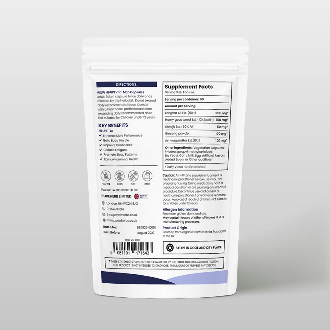 Vital Man is a powerful herbal blend crafted with Tongkat Ali, Horny Goat Weed, Panax Ginseng, Shilajit, and Ashwagandha.
