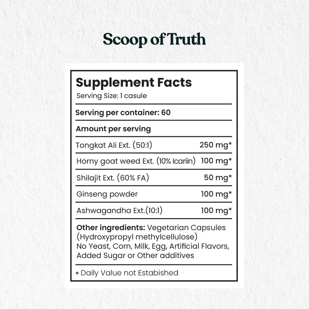 Vital Man combines Tongkat Ali, Horny Goat Weed, Panax Ginseng, Shilajit, and Ashwagandha in vegan capsules.